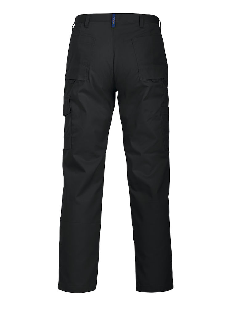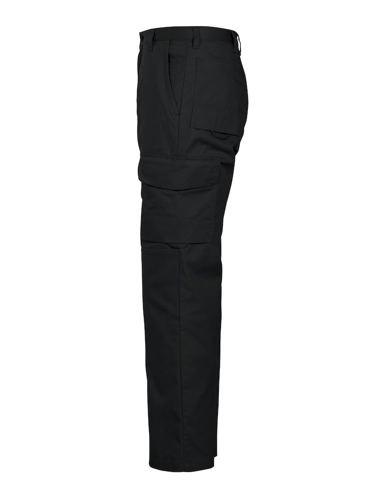 Arbeitshose ohne Bundfalte. Seitentaschen und Sicherheitstasche mit Reissverschluss auf der rechten Seite. Zwei aufgesetzte Gesässtaschen. Zwei Beintaschen. Die linke Tasche mit Patte und innen liegender Handy-Tasche. Die rechte Tasche bietet Platz für Mobiltelefon, Schreibgeräte, Dokumente und Zollstock. D-Ring für Schlüssel oder ID-Karte, etc.. Knieprotektortaschen mit Öffnungen auf der Innenseite des Hosenbeins. Schlaufen unter den Gesäss- und Beintaschen zur Befestigung von Inbags.