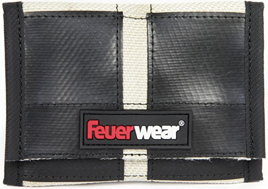 Flippiges Portemonnaie aus gebrauchtem Feuerwehrschlauch, LKW-Plane. Ausstattung: Grosses Münzfach, Klarsichtfach, 4 Fächer für Karten. Masse: Höhe = ca. 10 cm, Breite = ca. 14 cm, Tiefe = ca. 1,5 cm
