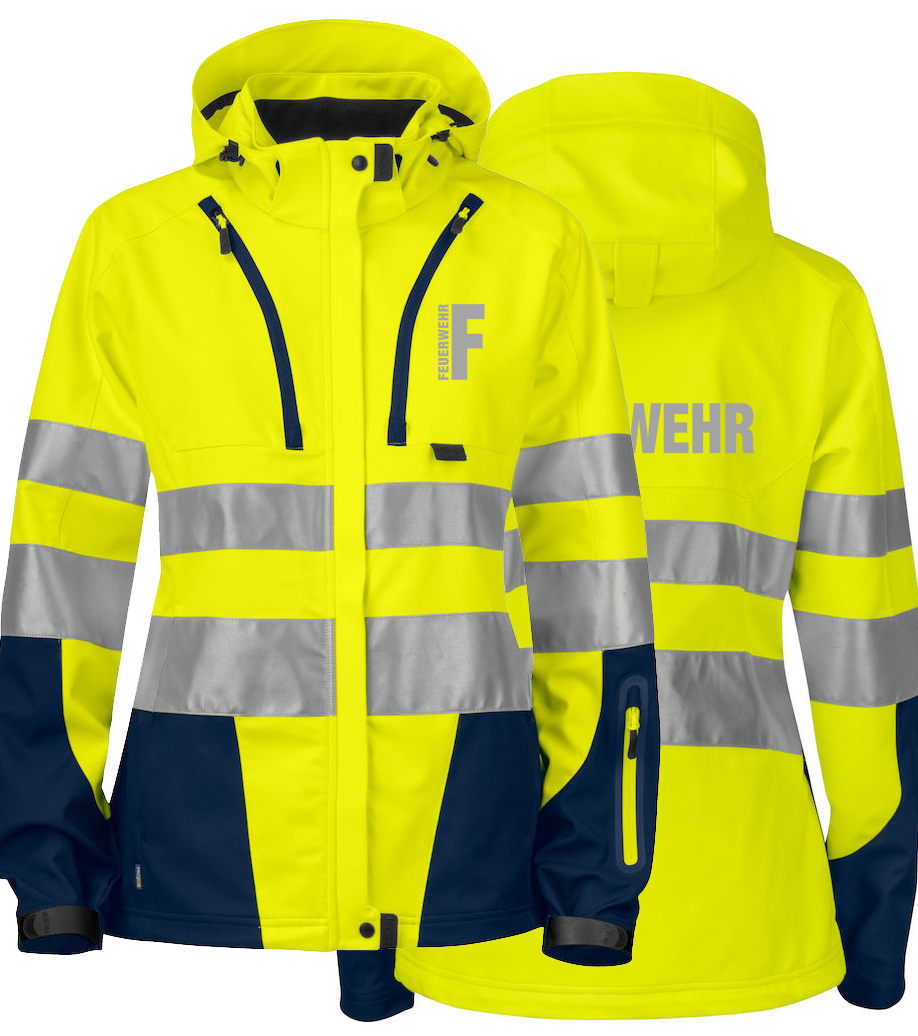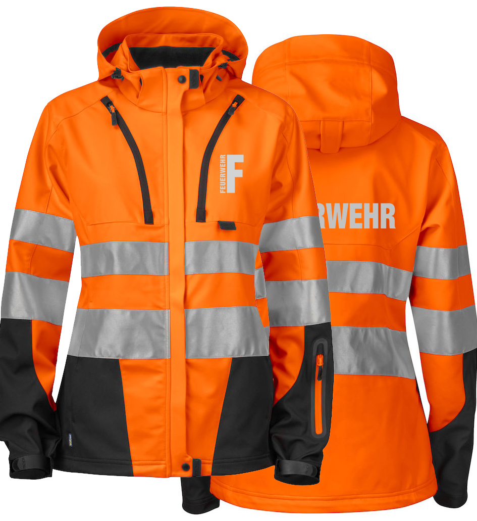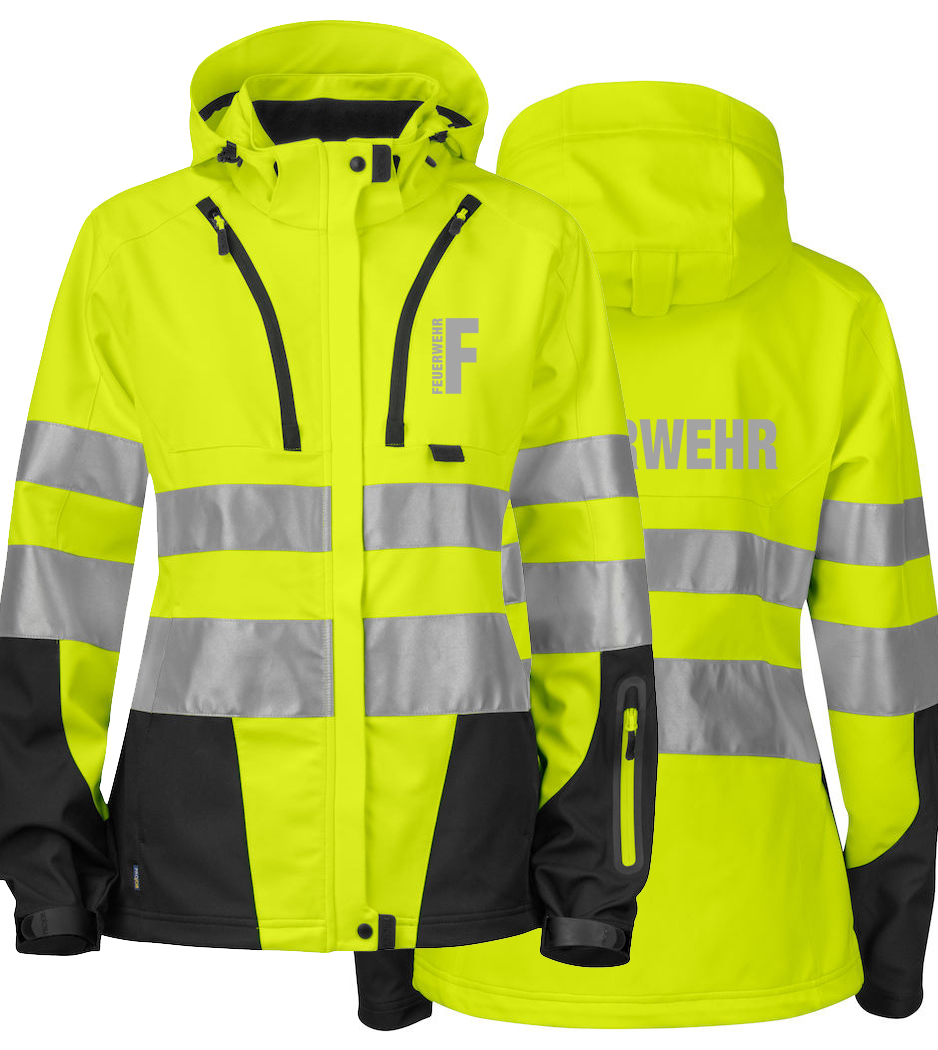 Softshell Damenjacke EN ISO20471 Klasse 3/2 Beschriftung refl. FEUERWEHR klein auf Brust und gross auf Rücken