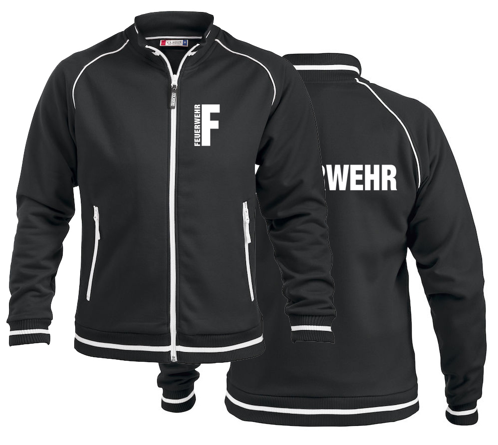 Sportliche Sweatjacke ohne Kapuze Beschriftung weiss FEUERWEHR klein auf Brust und gross auf Rücken