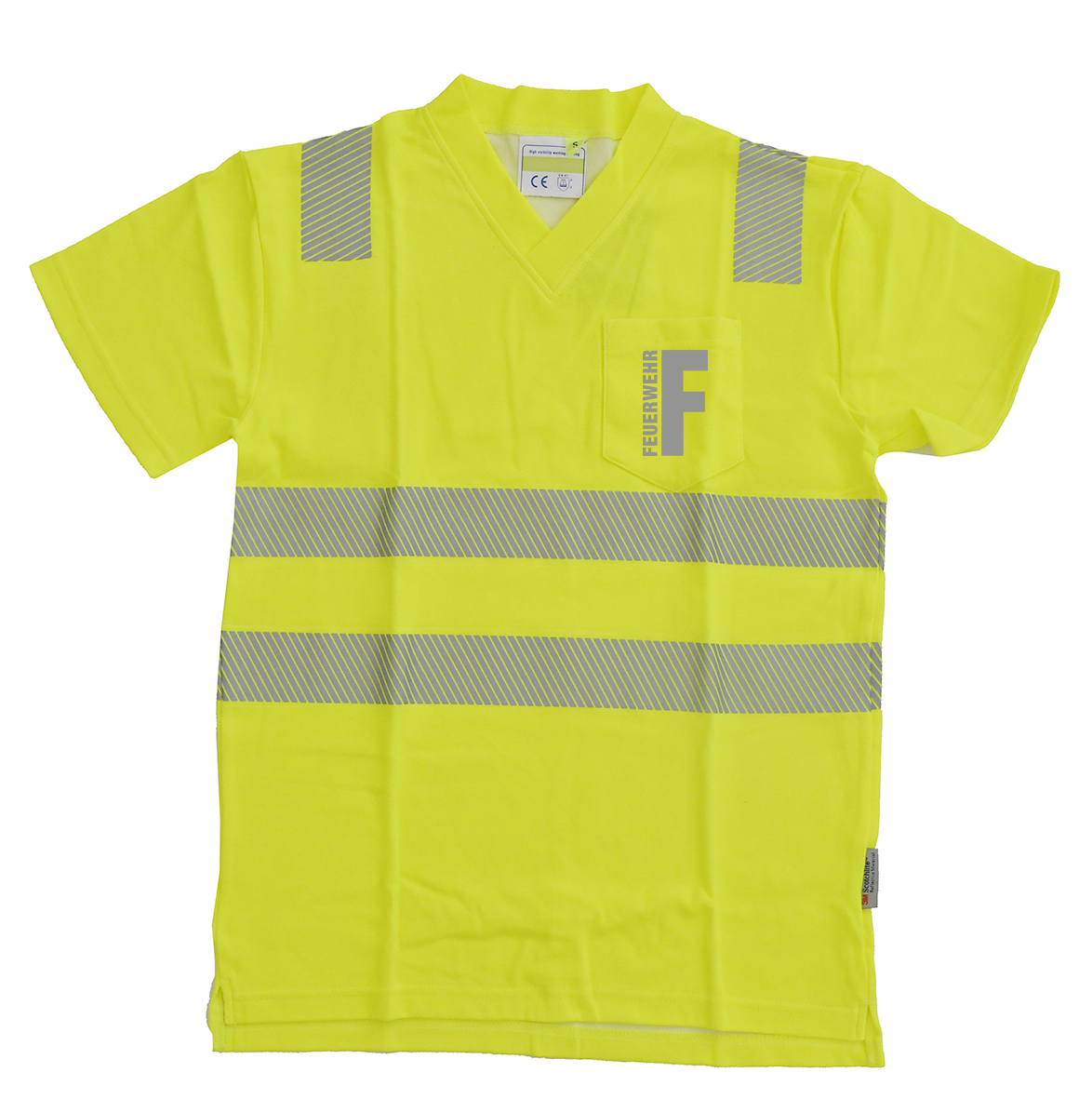 T-Shirt mit V-Ausschnitt ISO 20471 Klasse 2 Beschriftung refl. FEUERWEHR klein auf Brust