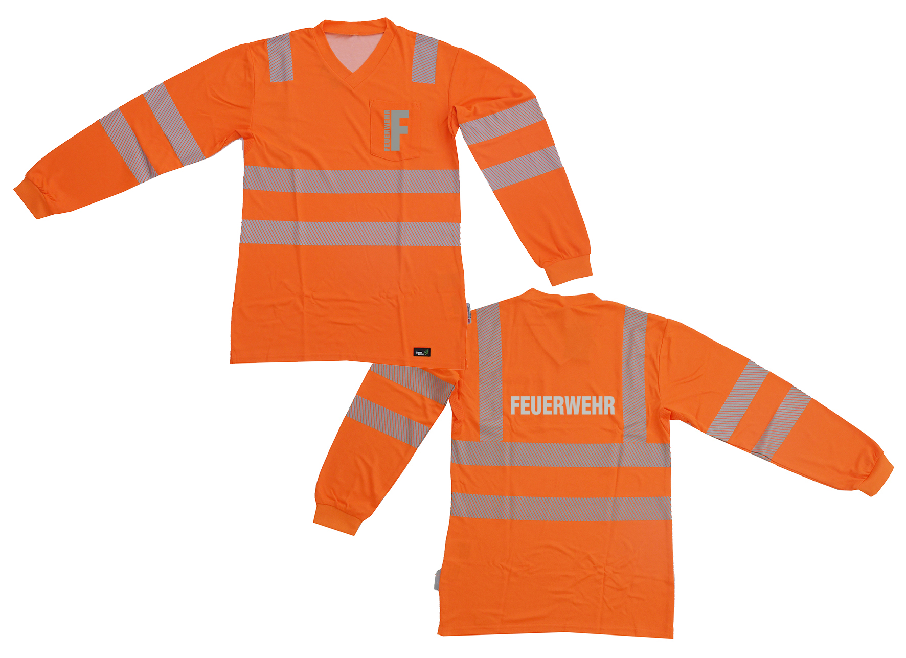 V-Neck Langarm T-Shirt ISO 20471 Klasse 2 Beschriftung refl. FEUERWEHR klein auf Brust und gross auf Rücken