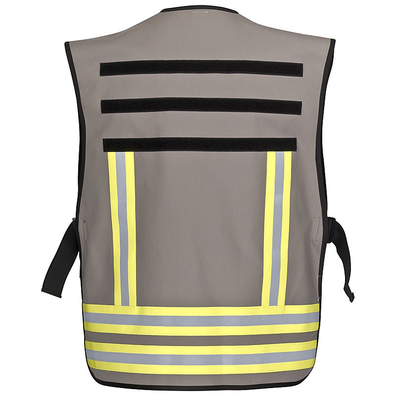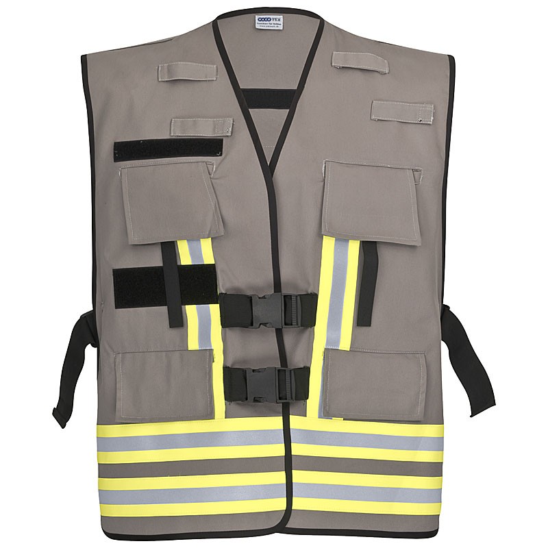Die Funktions- und Kennzeichnungsweste ist aus hochwertigem und fester 65% Baumwolle und 35% Polyester gefertigt. Die Funktionsweste ist mit schwarzem Aussenband eingefasst und hat 2 Seitentaschen mit Patte und Klett, 2 Funkgerätetaschen mit Patte und Klett, mittels Klett in der Tiefe verstellbar, jeweils mit Antennenschlaufe, durch Klettlasche zusätzlich zu sichern. Universalgrösse XXL, seitlich durch elastisches Band mit Schnalle weitenverstellbar, vorn durch 2 Schnallen zu schliessen. Original 3M™ Scotchlite™ Reflexband gelb/silber/gelb 2-fach am Jackensaum umlaufend sowie im Brust- und Rückenbereich je 2 Streifen senkrecht. Durch Verwendung von Flauschbändern flexibel für unterschiedliche Einsatzsituationen verwendbar. Flausch für Reflexschild 38 x 16 cm auf dem Rücken sowie für ein Brustschild 15 x 5 cm und ein Klettstreifen für Namensschilder in 130 x 25 mm auf der rechten Brustseite. Die Schilder sind nicht im Lieferumfang enthalten.