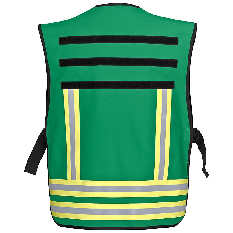 Die Funktions- und Kennzeichnungsweste ist aus hochwertigem und fester 65% Baumwolle und 35% Polyester gefertigt. Die Funktionsweste ist mit schwarzem Aussenband eingefasst und hat 2 Seitentaschen mit Patte und Klett, 2 Funkgerätetaschen mit Patte und Klett, mittels Klett in der Tiefe verstellbar, jeweils mit Antennenschlaufe, durch Klettlasche zusätzlich zu sichern. Universalgrösse XXL, seitlich durch elastisches Band mit Schnalle weitenverstellbar, vorn durch 2 Schnallen zu schliessen. Original 3M™ Scotchlite™ Reflexband gelb/silber/gelb 2-fach am Jackensaum umlaufend sowie im Brust- und Rückenbereich je 2 Streifen senkrecht. Durch Verwendung von Flauschbändern flexibel für unterschiedliche Einsatzsituationen verwendbar. Flausch für Reflexschild 38 x 16 cm auf dem Rücken sowie für ein Brustschild 15 x 5 cm und ein Klettstreifen für Namensschilder in 130 x 25 mm auf der rechten Brustseite. Die Schilder sind nicht im Lieferumfang enthalten.