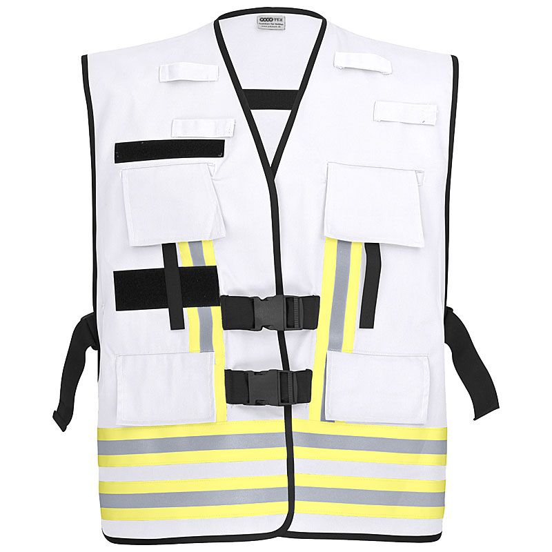 Die Funktions- und Kennzeichnungsweste ist aus hochwertigem und fester 65% Baumwolle und 35% Polyester gefertigt. Die Funktionsweste ist mit schwarzem Aussenband eingefasst und hat 2 Seitentaschen mit Patte und Klett, 2 Funkgerätetaschen mit Patte und Klett, mittels Klett in der Tiefe verstellbar, jeweils mit Antennenschlaufe, durch Klettlasche zusätzlich zu sichern. Universalgrösse XXL, seitlich durch elastisches Band mit Schnalle weitenverstellbar, vorn durch 2 Schnallen zu schliessen. Original 3M™ Scotchlite™ Reflexband gelb/silber/gelb 2-fach am Jackensaum umlaufend sowie im Brust- und Rückenbereich je 2 Streifen senkrecht. Durch Verwendung von Flauschbändern flexibel für unterschiedliche Einsatzsituationen verwendbar. Flausch für Reflexschild 38 x 16 cm auf dem Rücken sowie für ein Brustschild 15 x 5 cm und ein Klettstreifen für Namensschilder in 130 x 25 mm auf der rechten Brustseite. Die Schilder sind nicht im Lieferumfang enthalten.