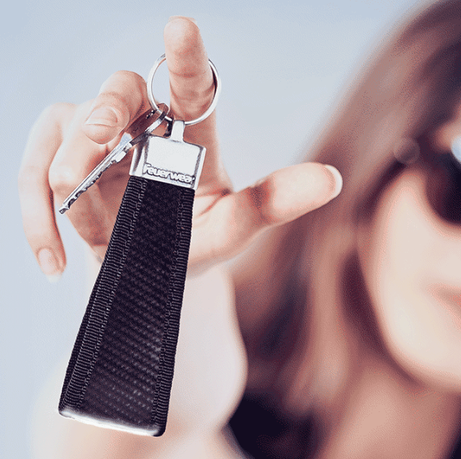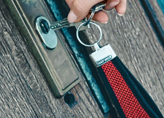 Für Sasha wurde das besondere Ausgangsmaterial Feuerwehrschlauch zu einer elegant geschnittenen Schlaufe geformt und dezent in Schwarz eingefasst. Er macht jeden Dreh im Schloss mit, denn der Ring für die Schlüssel ist flexibel kreisend an der Schlaufe befestigt.